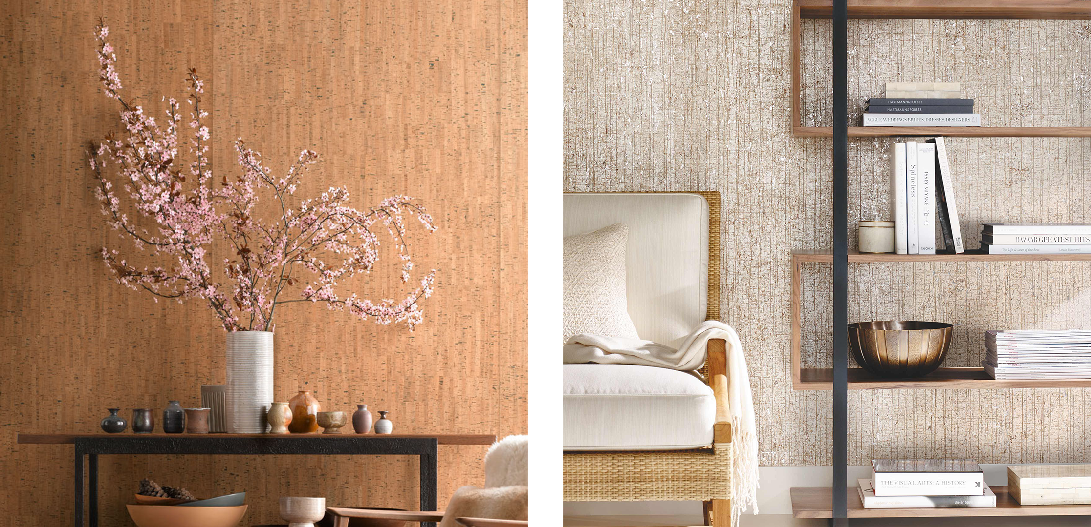If you’ve ever run your hands over a natural cork wallcovering, you may have been surprised how soft and suede-like it felt; there’s something textural and tactile about it. The warmth of this natural product lends itself to just about any design style and connects the interior environment to the natural world outside. In addition to the aesthetic beauty of cork, it’s also a sustainable and renewable resource.