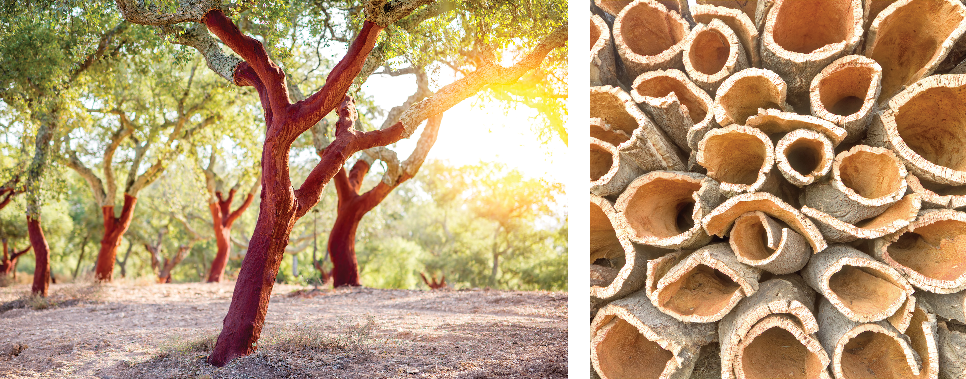 Cork is harvested in Portugal from the Cork Oak Tree’s inner layer of bark tissue. Because only the cork is harvested, the tree remains healthy and can actually absorb three times as much CO2 as an unharvested tree. Cork Oaks are unique in that they can regenerate their outer bark, and over the average lifetime of 200 years, the tree can be harvested over 16 times. These evergreen trees grow to heights of 65 feet, increasing the amount of cork harvested with each interval over its lifetime.