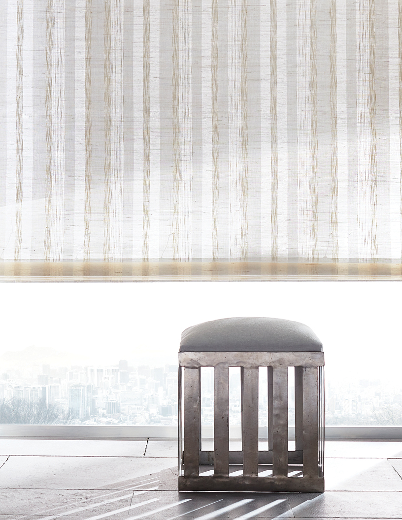 Gossamer – Bojagi, a traditional Korean silk patchwork that becomes more beautiful and translucent with age, served as the inspiration for this tonal series. Alternating tight and loose weaves, rendered in ramie and warp threads, produce a beautifully irregular striped pattern, and its natural drape and rich texture highlights Gossamer’s handwoven quality and the Japanese aesthetic of wabi-sabi.