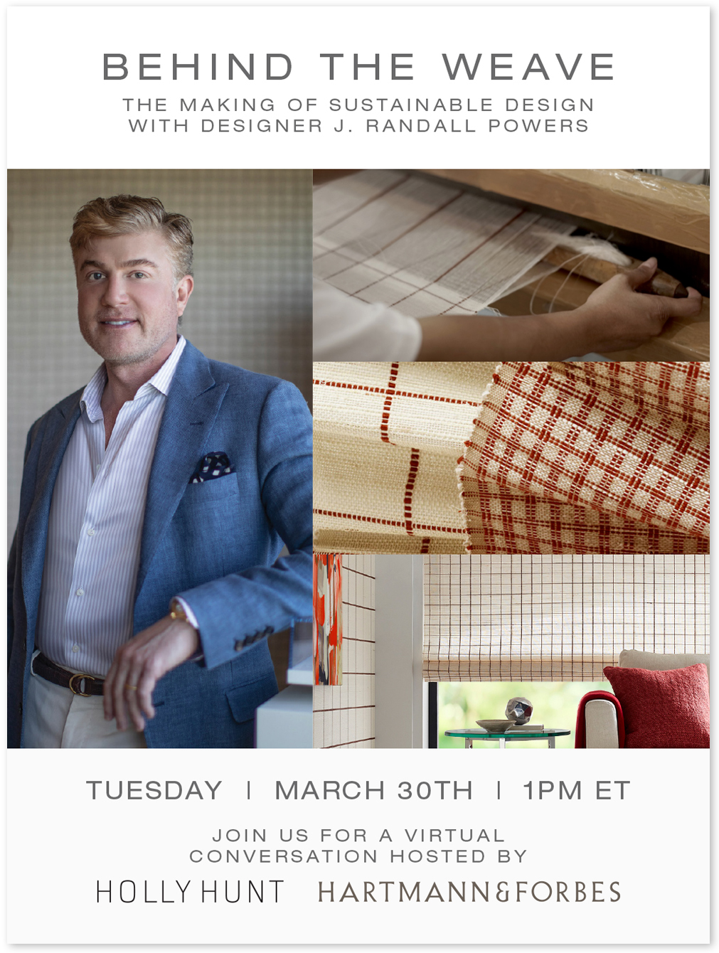 Award-winning designer J. Randall Powers is known for his tailored and sophisticated spaces. He brings that aesthetic to his new collection with Hartmann&Forbes. Join us for a conversation with the Elle Décor A-Lister and Hartmann&Forbes Director of Product Development, Rebecca Welch, as they discuss the elevated designs of his sustainable window and wall covering line. Moderated by Sabine Rothman, Creative Consultant and Co-founder of Interiors Academy.