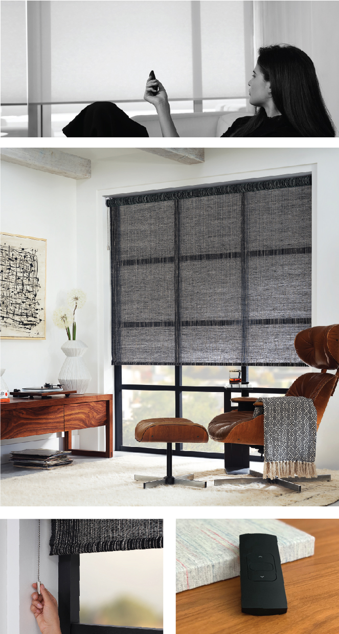 With over 400 weave options, the Newton Smart Shade System is available for Natural Woven Shades, Fabric Shades, and Performance Rollershades in Roman, Roller, or Rollerfold styles.