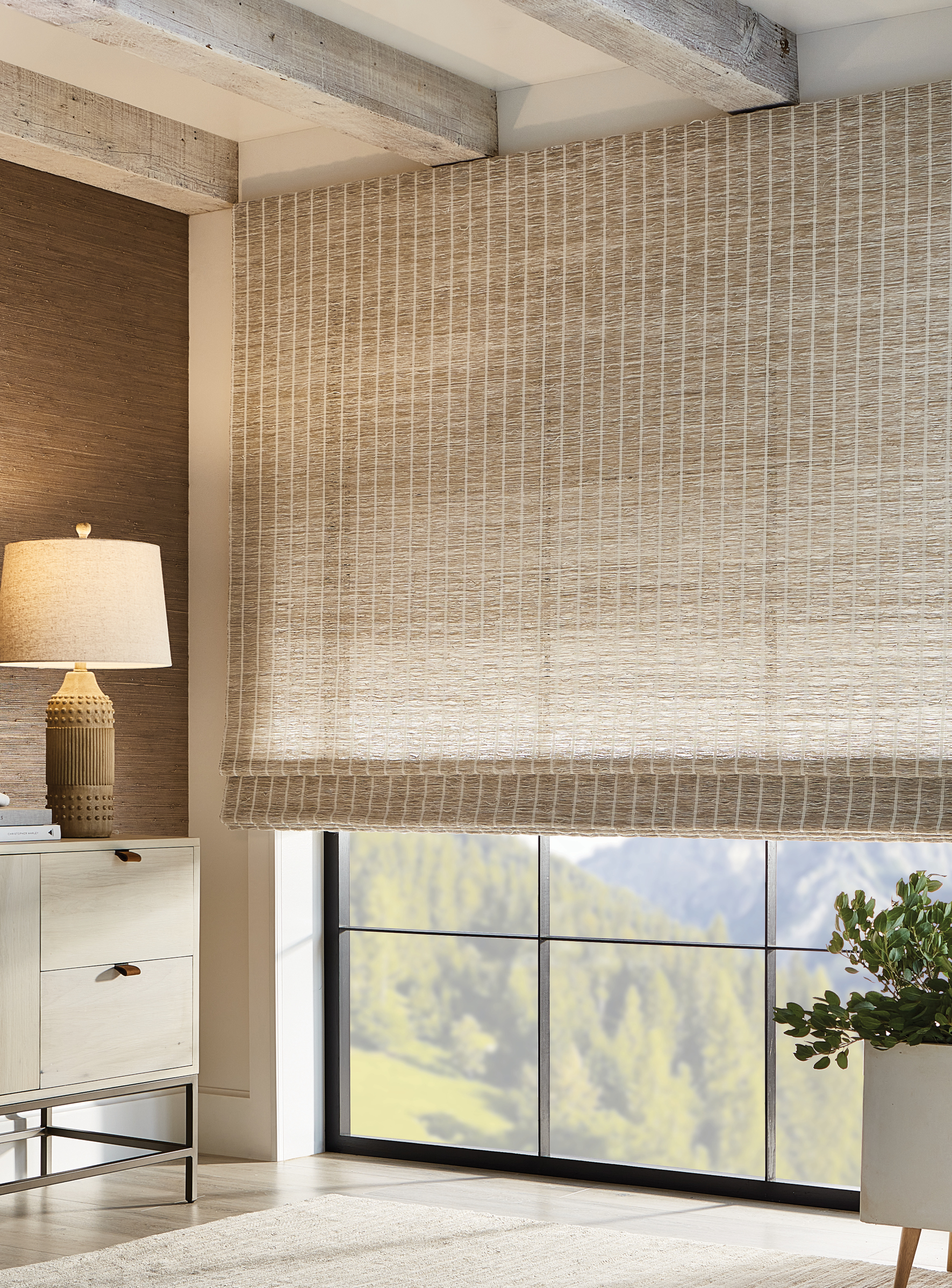 This elegant series produces a beautiful play of light through the filter of its open grassweave. Slender, vertical stripes juxtaposed with a relaxed ramie base bring a modern spin to a classic design in colors that seamlessly coordinate with our Driftwood series.