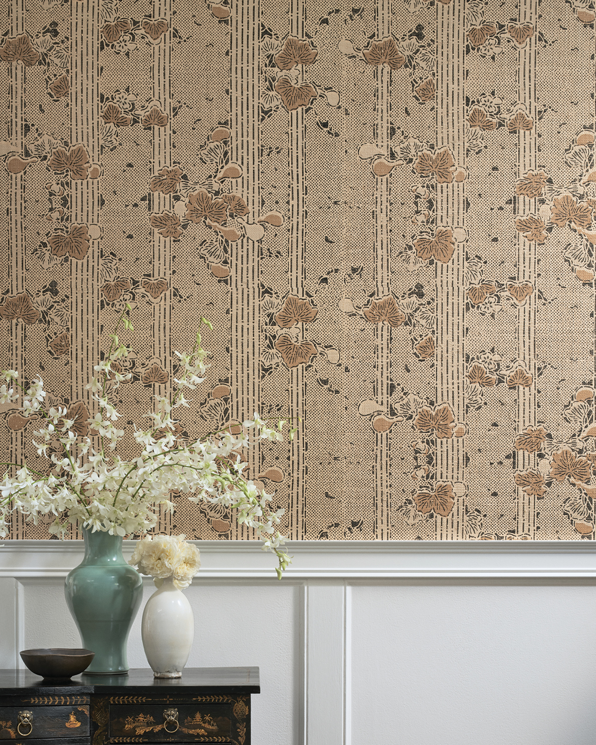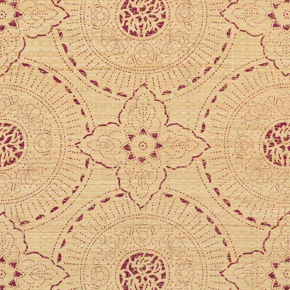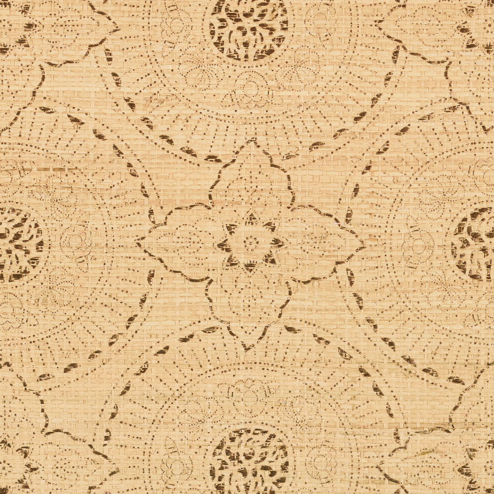 At once romantic and refined, Madeleine wallcovering was inspired by a fern motif often used by Madeleine Castaing, the iconic 20th-century French designer and antique dealer. Natural sisal is meticulously embroidered in a palette of sage, linden, and teal, creating a dimensional pattern of interlocking ferns, which is framed by a crisp windowpane grid. The wallcovering’s lyrical pattern and earthy colors pair perfectly with the Jacob Stripe windowcovering.
