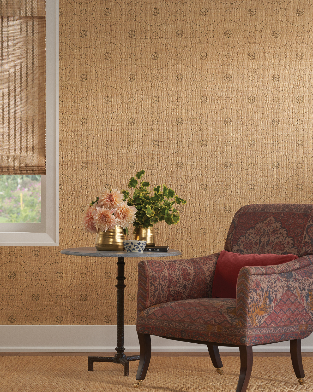 At once romantic and refined, Madeleine wallcovering was inspired by a fern motif often used by Madeleine Castaing, the iconic 20th-century French designer and antique dealer. Natural sisal is meticulously embroidered in a palette of sage, linden, and teal, creating a dimensional pattern of interlocking ferns, which is framed by a crisp windowpane grid. The wallcovering’s lyrical pattern and earthy colors pair perfectly with the Jacob Stripe windowcovering.