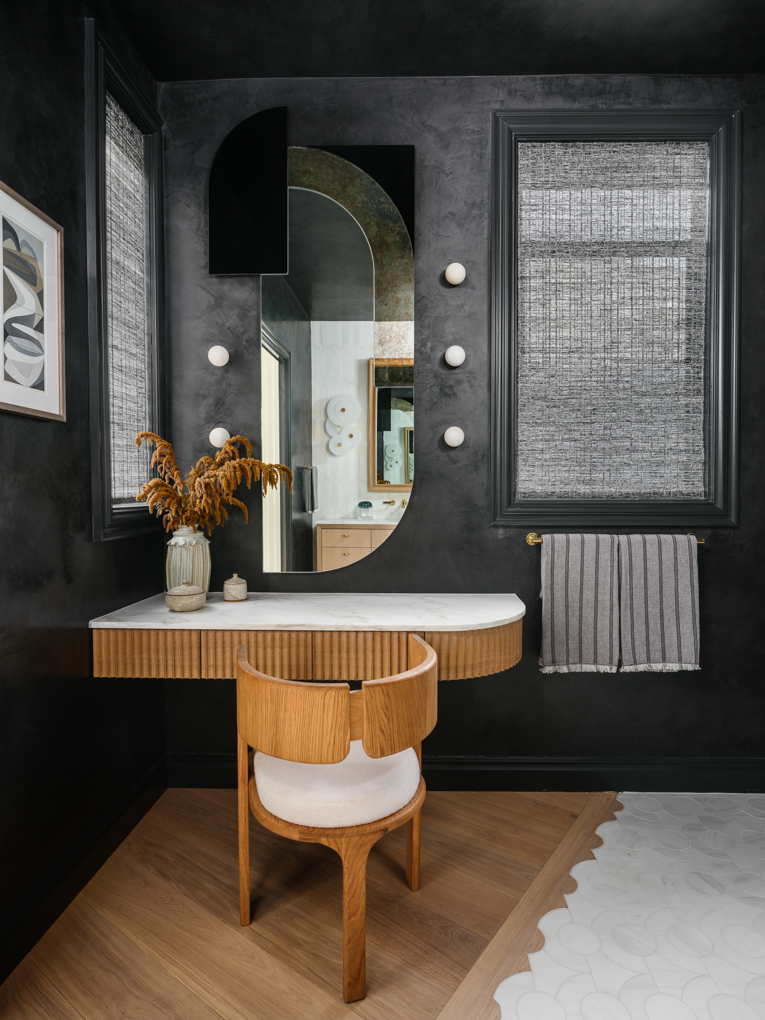 In contrast, the Primary Bath and Dressing room present a darker and moodier theme and are the bedroom's sultry counterpart. “Curve Appeal,” the primary bath is designed as a personal retreat for two, bringing strength, order, and grace to the space.