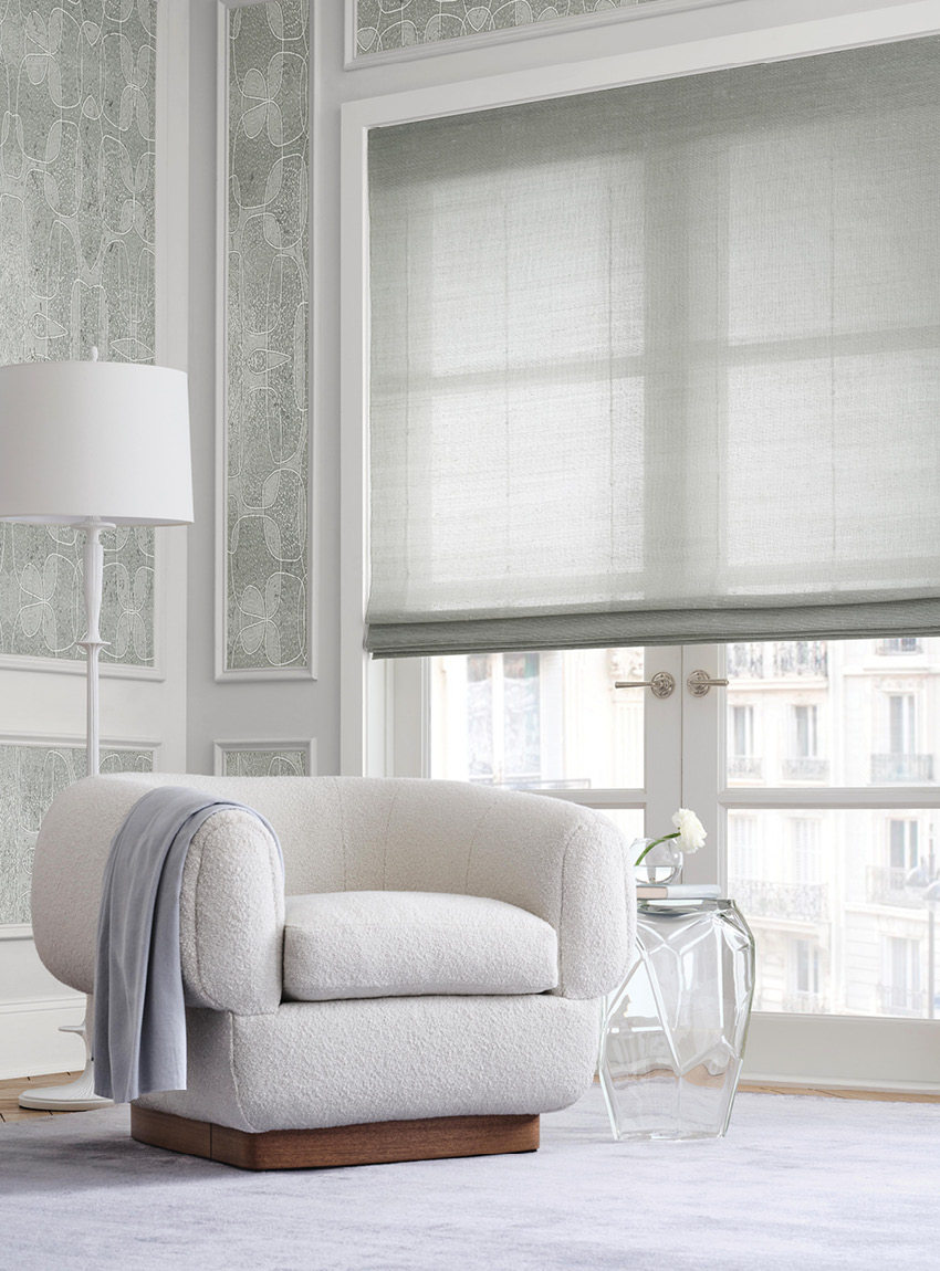 Delicately woven by hand from ramie and lustrous banana fibers, this elegant windowcovering has just a hint of color and softly lets the light retreat.
