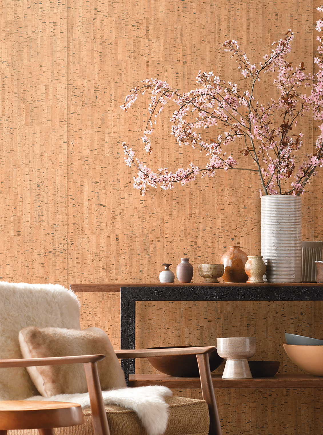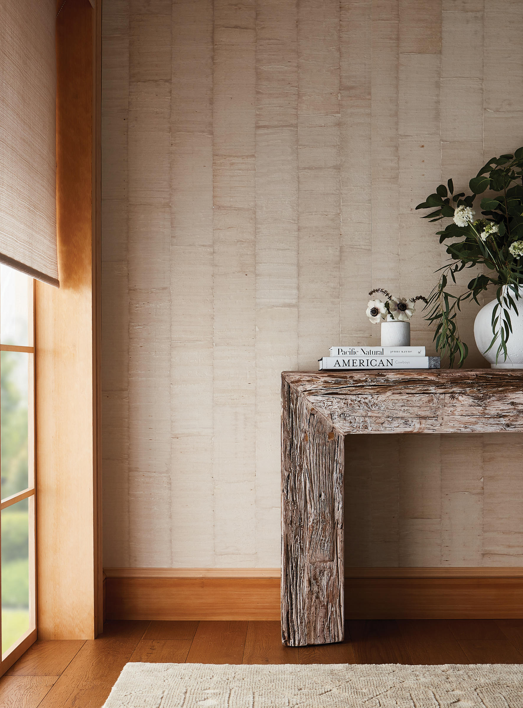 Aleutian’s soft, suede-like texture reveals one-of-a-kind tonal variations that enrich this exotic, artisan-crafted wallcovering. Painstakingly hand-placed sano panels in an organic palette create a quiet composition.