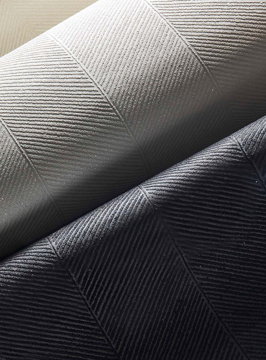 Reflecting the dramatic rise and fall of a spring tide, the Coastline series presents an oversized, herringbone-inspired mica sand pattern complemented by a dramatic metallic backdrop.