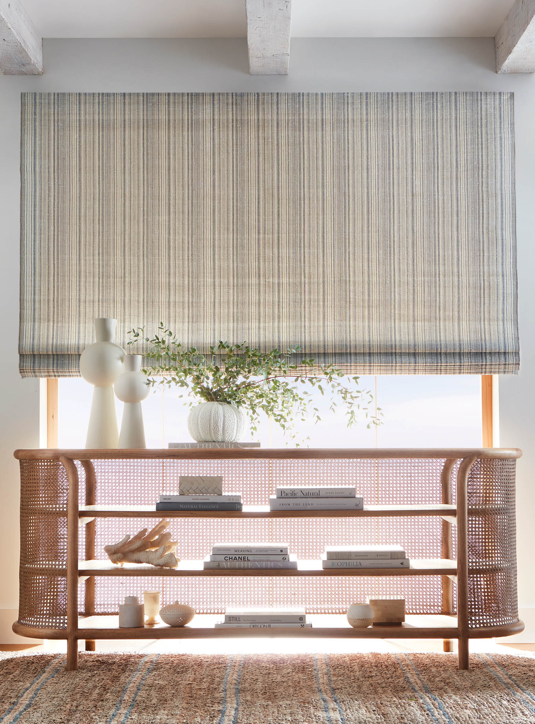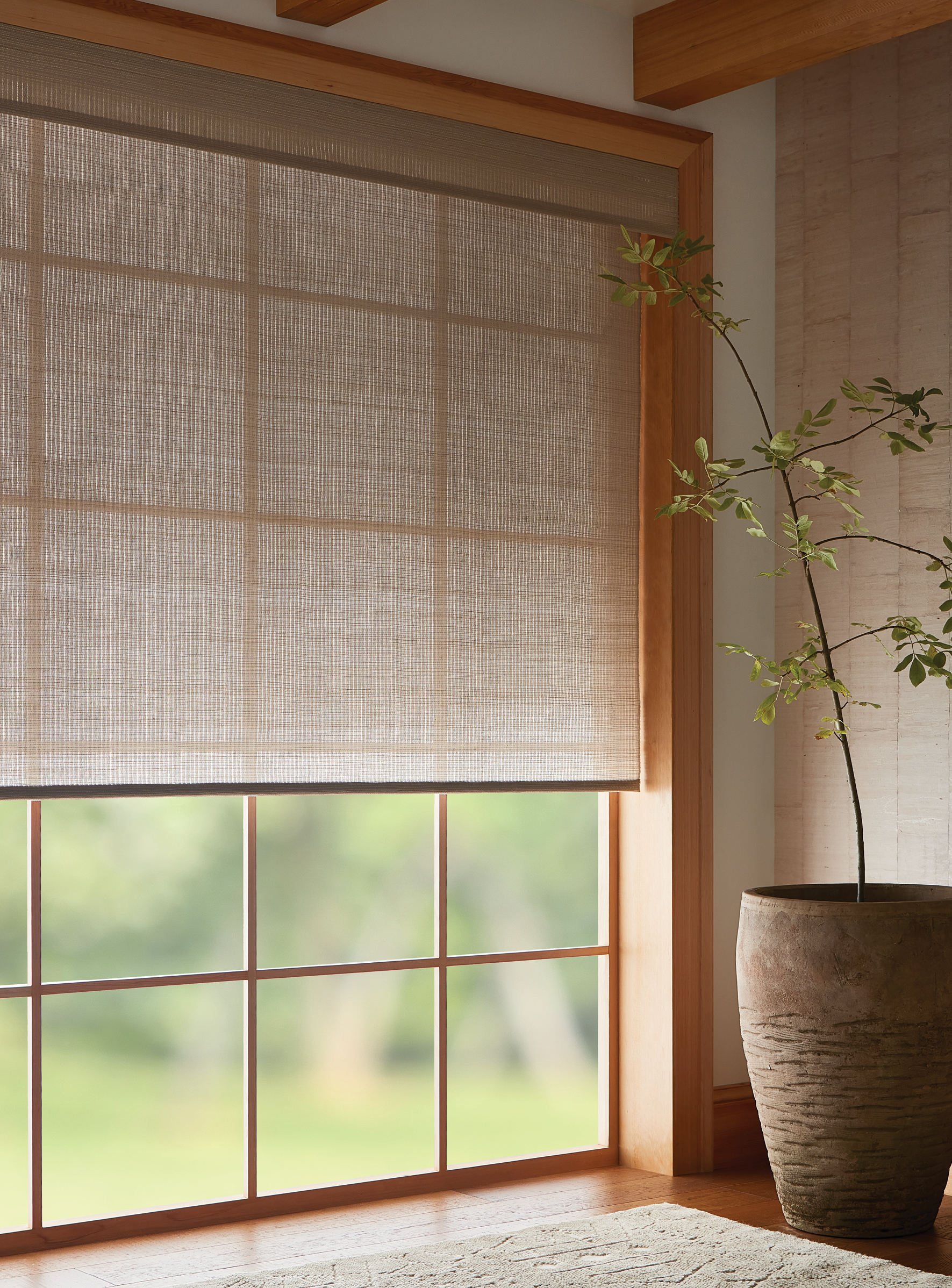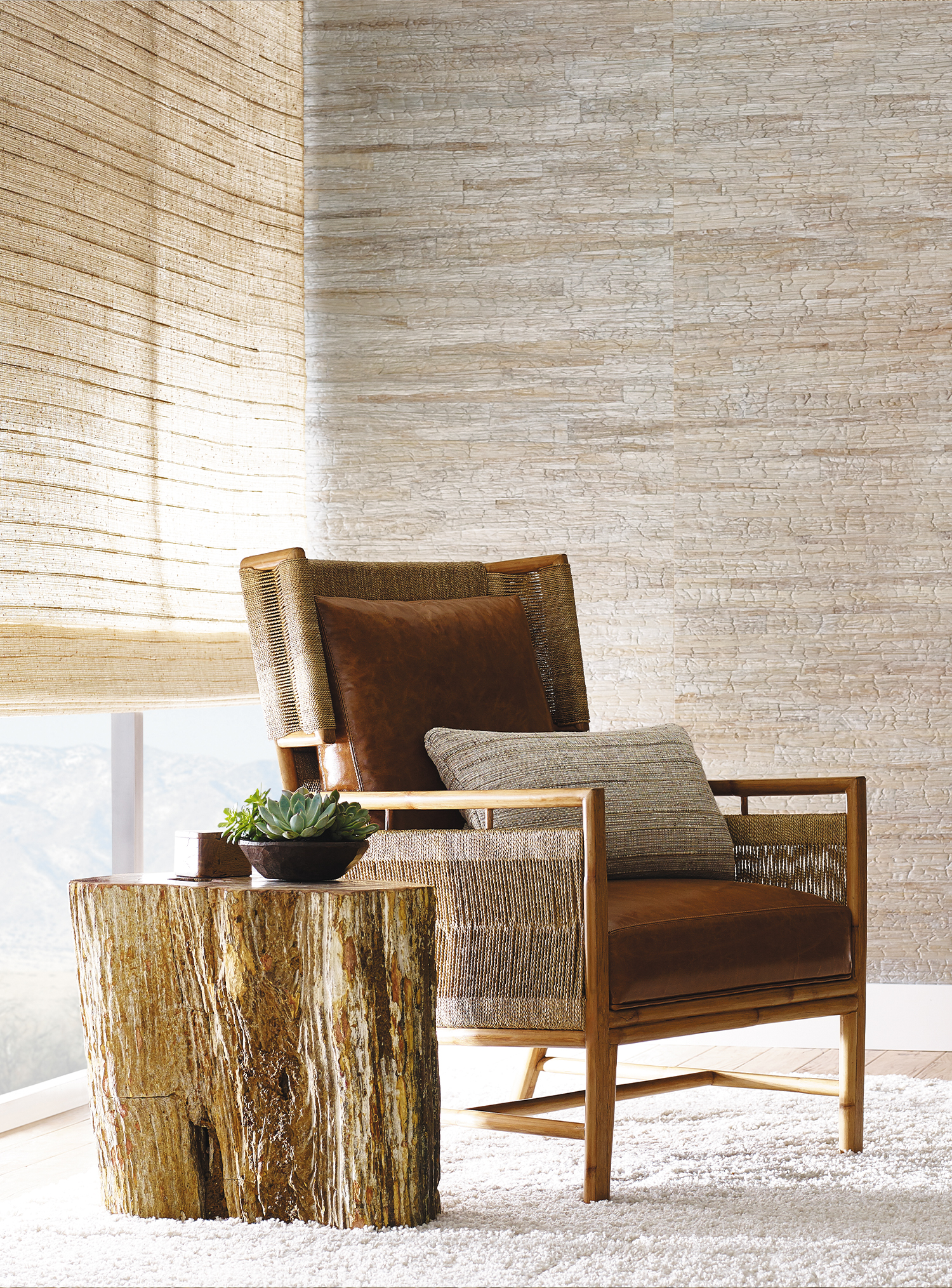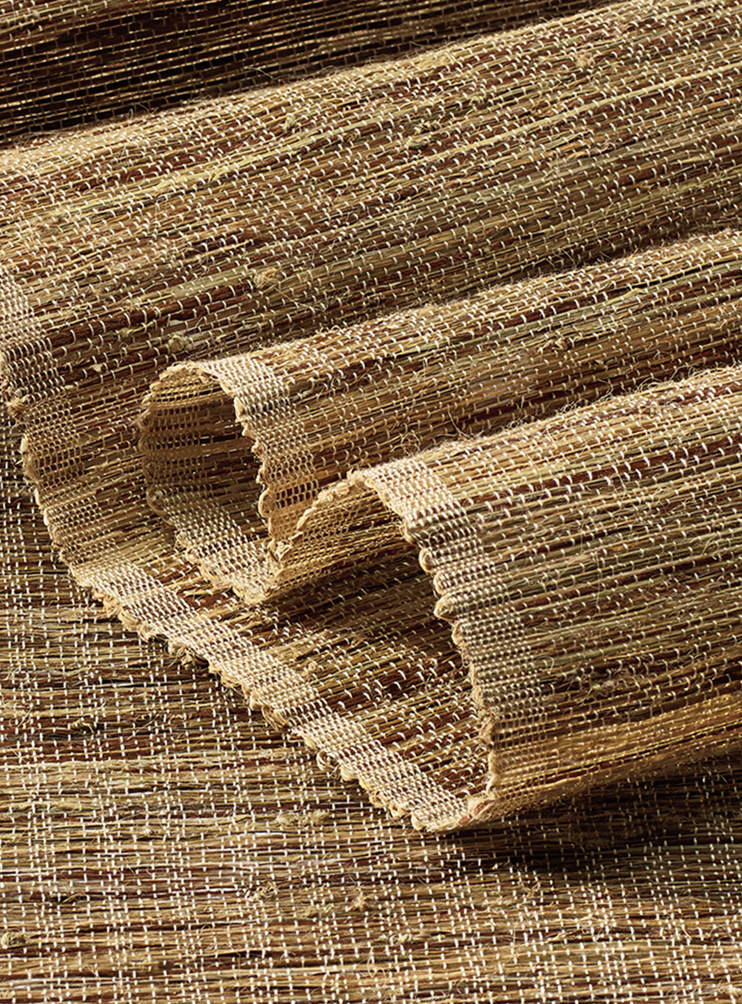An earthy fragrance lingers in the hand-placed vetiver roots, their fibrous texture stretching across the shifting tones of the warp. Like vines finding their path, the strands create a surface that feels both rooted and fluid, casting light with nuanced dimension.