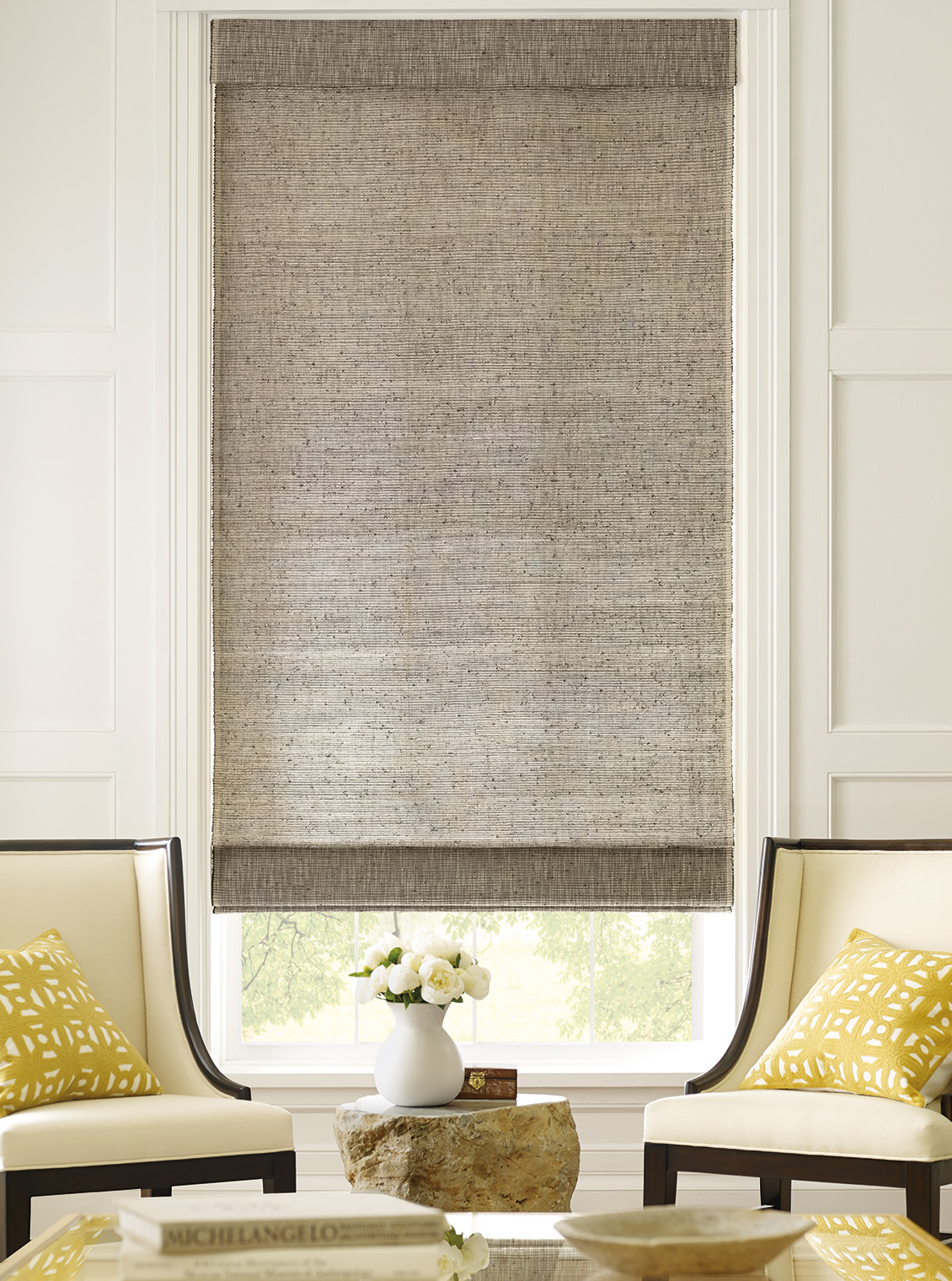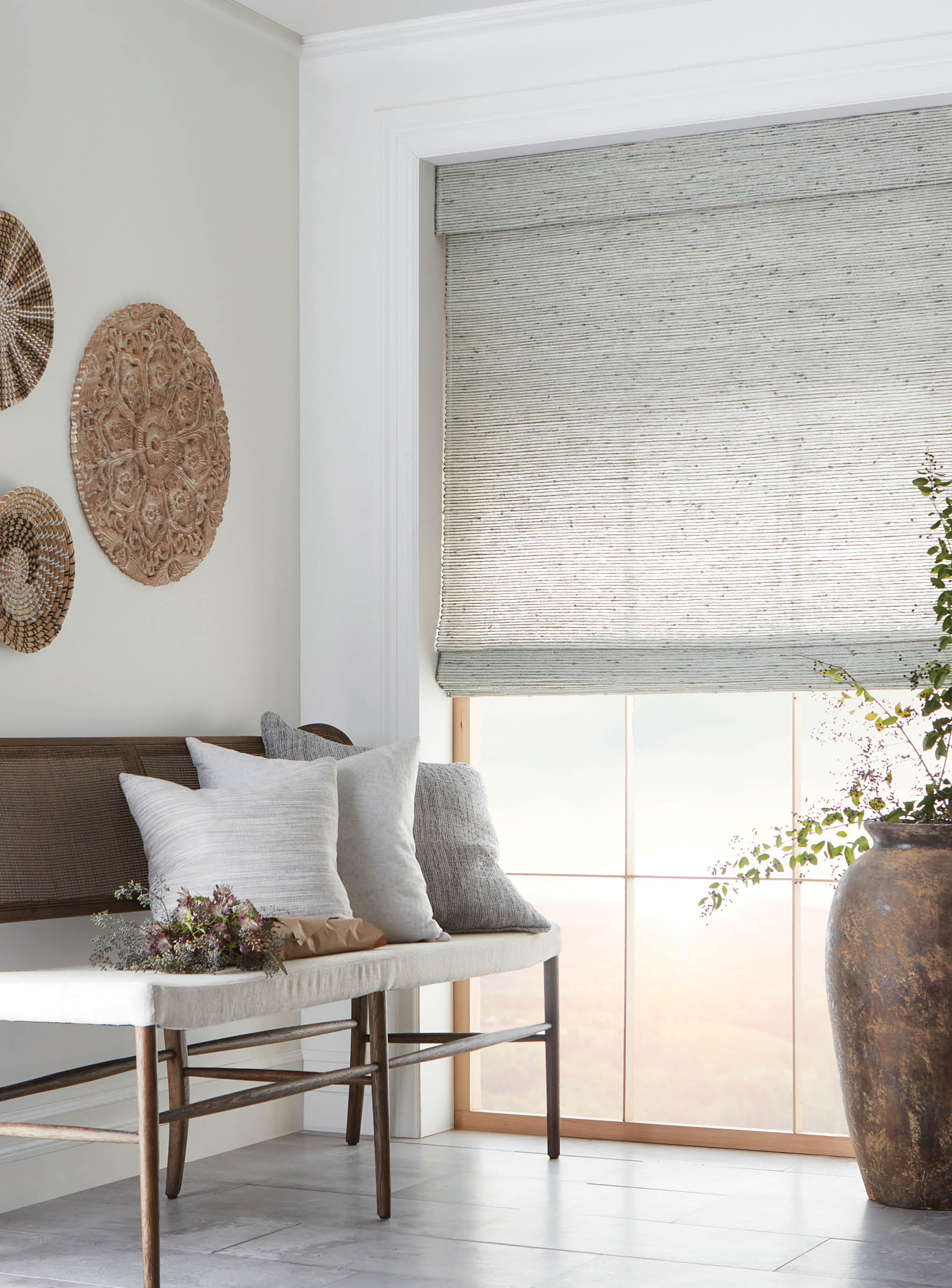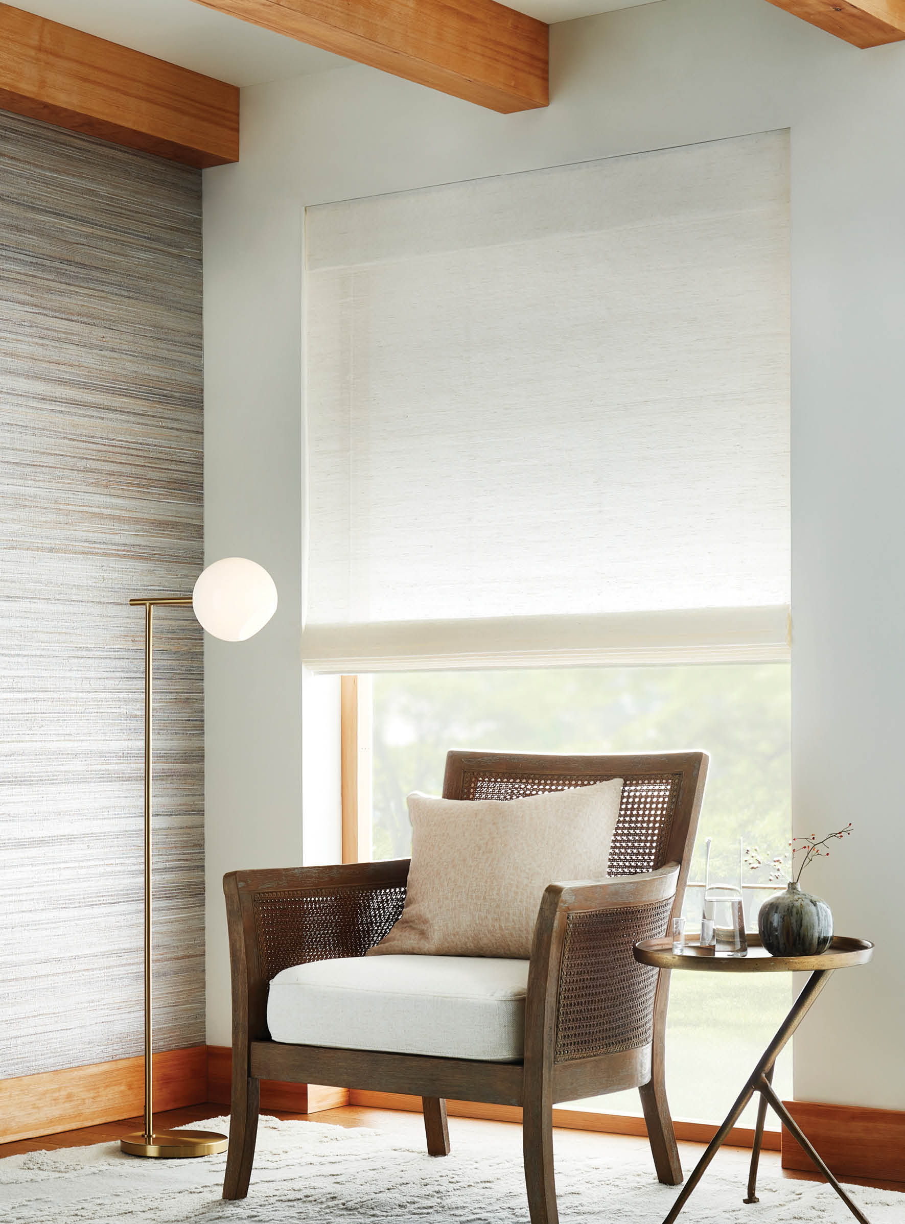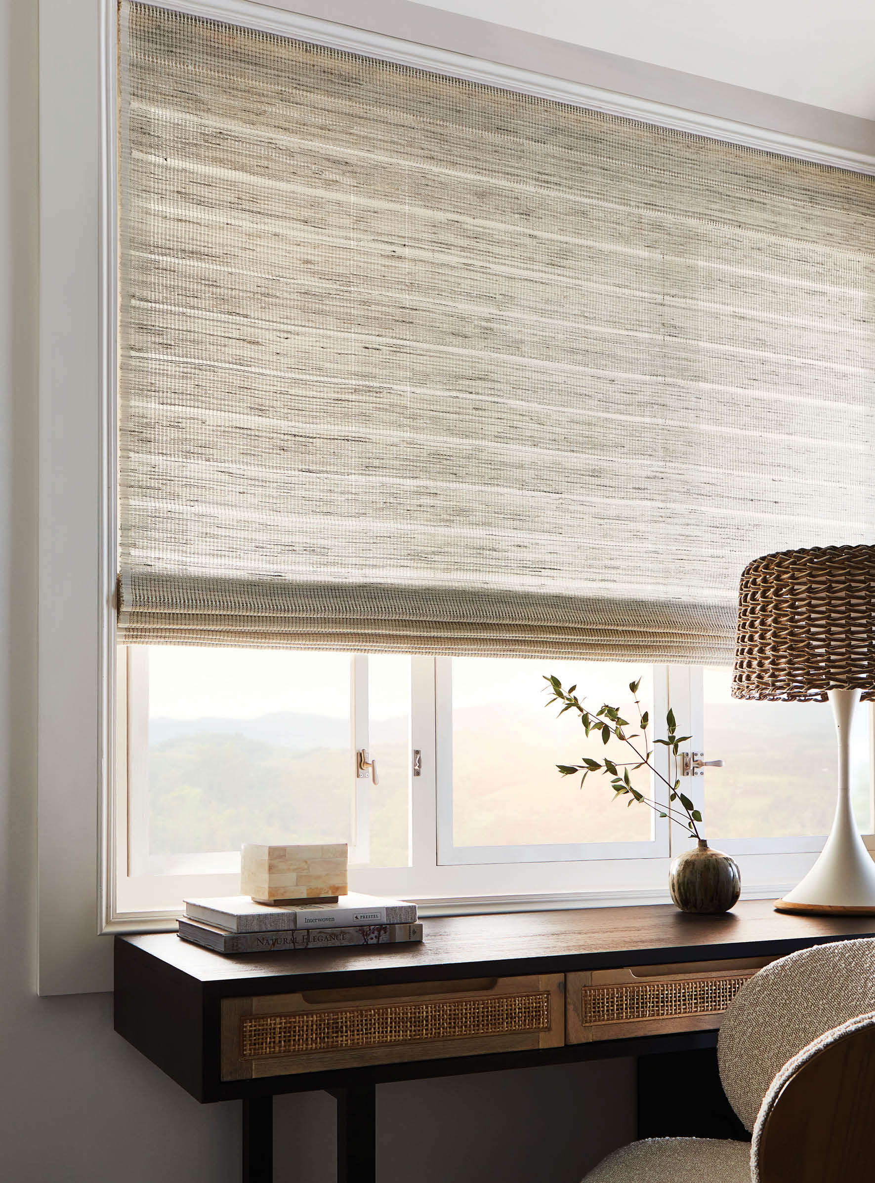 An earthy fragrance lingers in the hand-placed vetiver roots, their fibrous texture stretching across the shifting tones of the warp. Like vines finding their path, the strands create a surface that feels both rooted and fluid, casting light with nuanced dimension.
