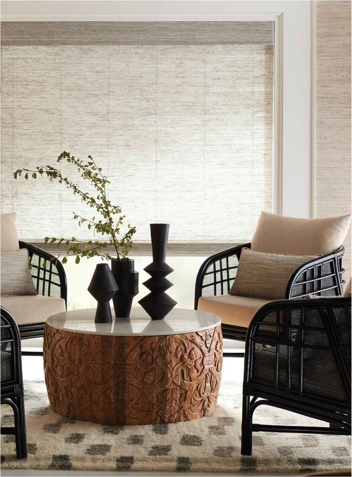 An earthy fragrance lingers in the hand-placed vetiver roots, their fibrous texture stretching across the shifting tones of the warp. Like vines finding their path, the strands create a surface that feels both rooted and fluid, casting light with nuanced dimension.